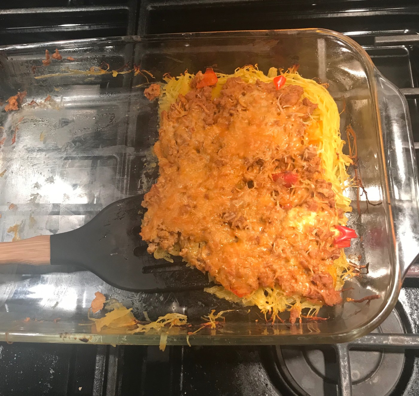 Please note, this recipe is incredibly simple, but it can be time-consuming. If you make the spaghetti squash and/or taco meat ahead of time, this becomes a quick weeknight success. You’ll notice my family liked it so much, I only got a photo of half of it!